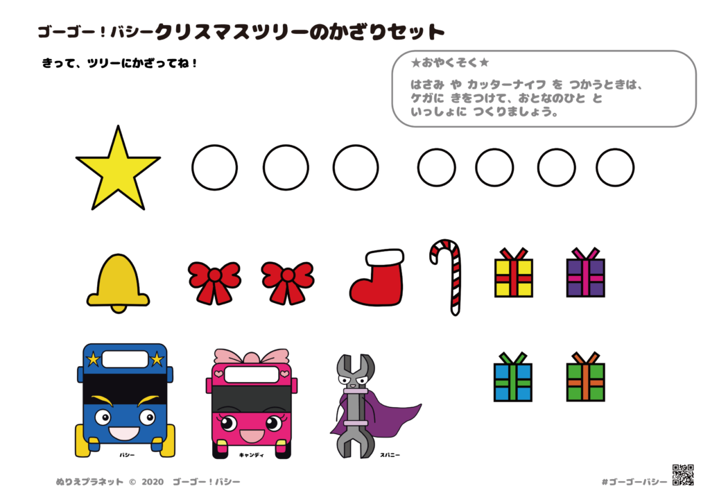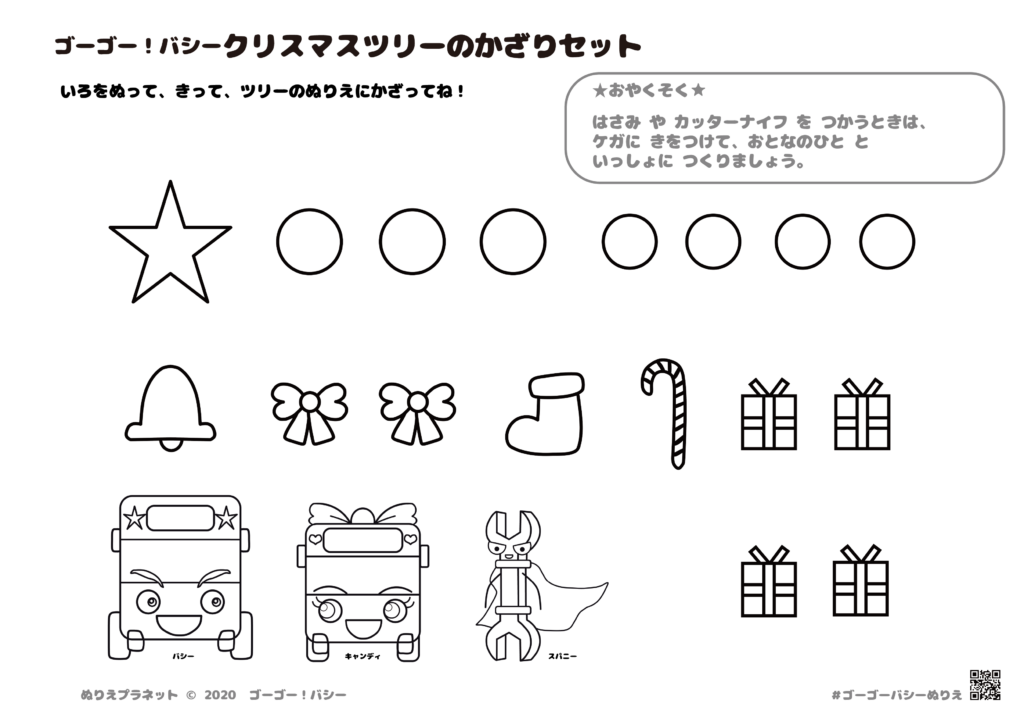 ぬって、きって、はって、飾ろう!ゴーゴーバシーのクリスマスツリーぬりえです。