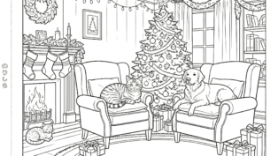 【無料ダウンロード】クリスマスの風景を描いた塗り絵です。暖炉やクリスマスツリーがある暖かい部屋の様子は、高齢者の12月のレクリエーションや大人の趣味に最適。A4サイズで印刷してすぐに楽しめます。